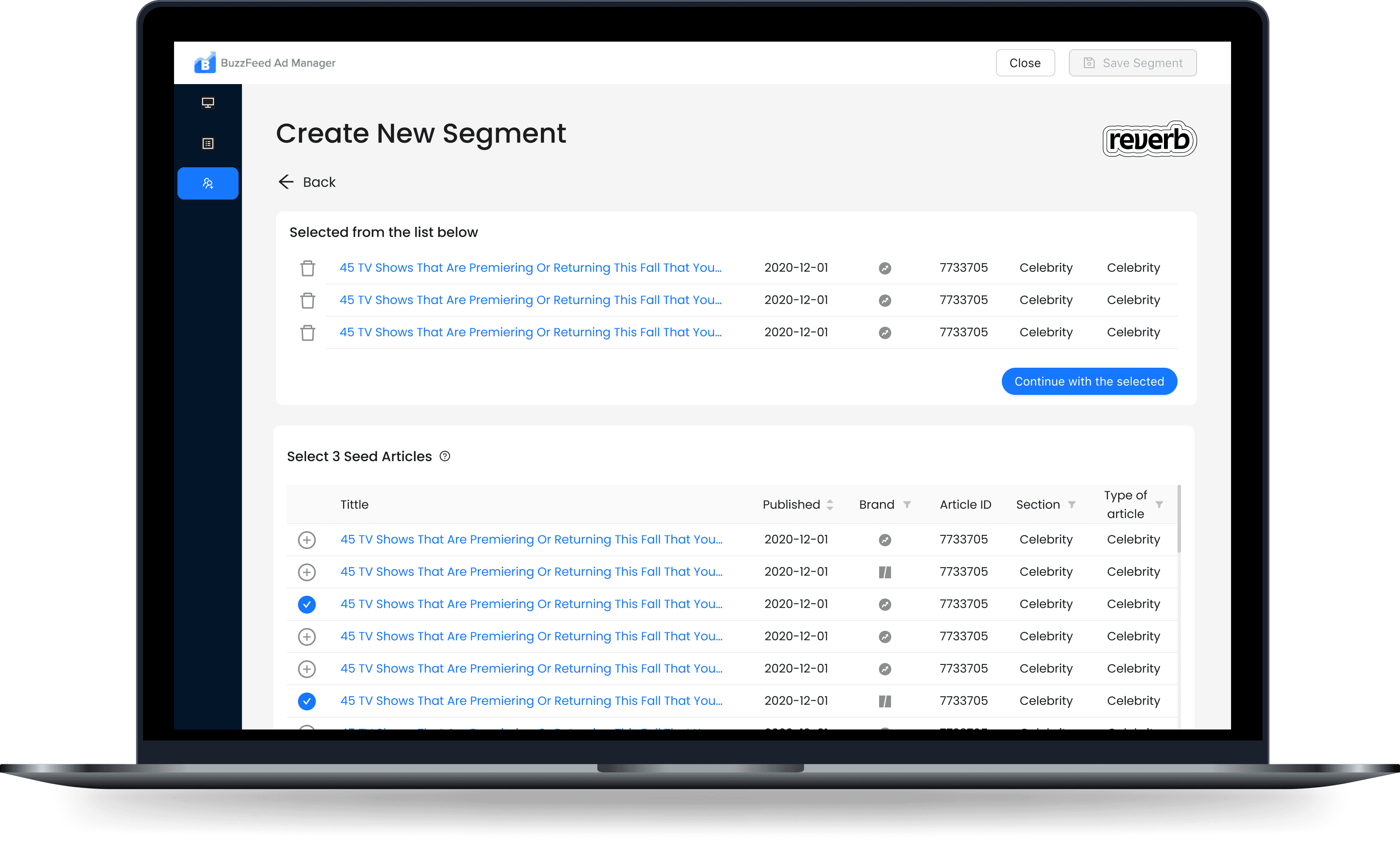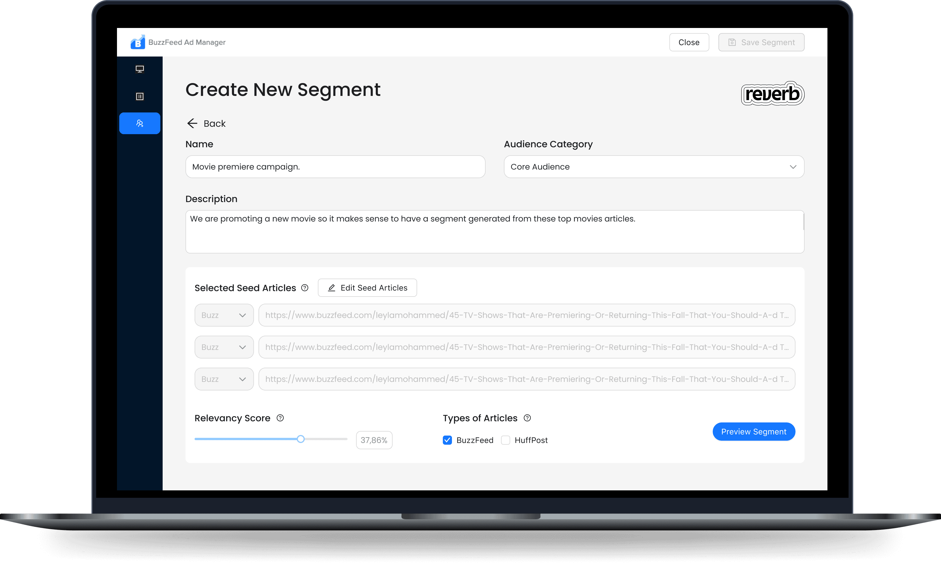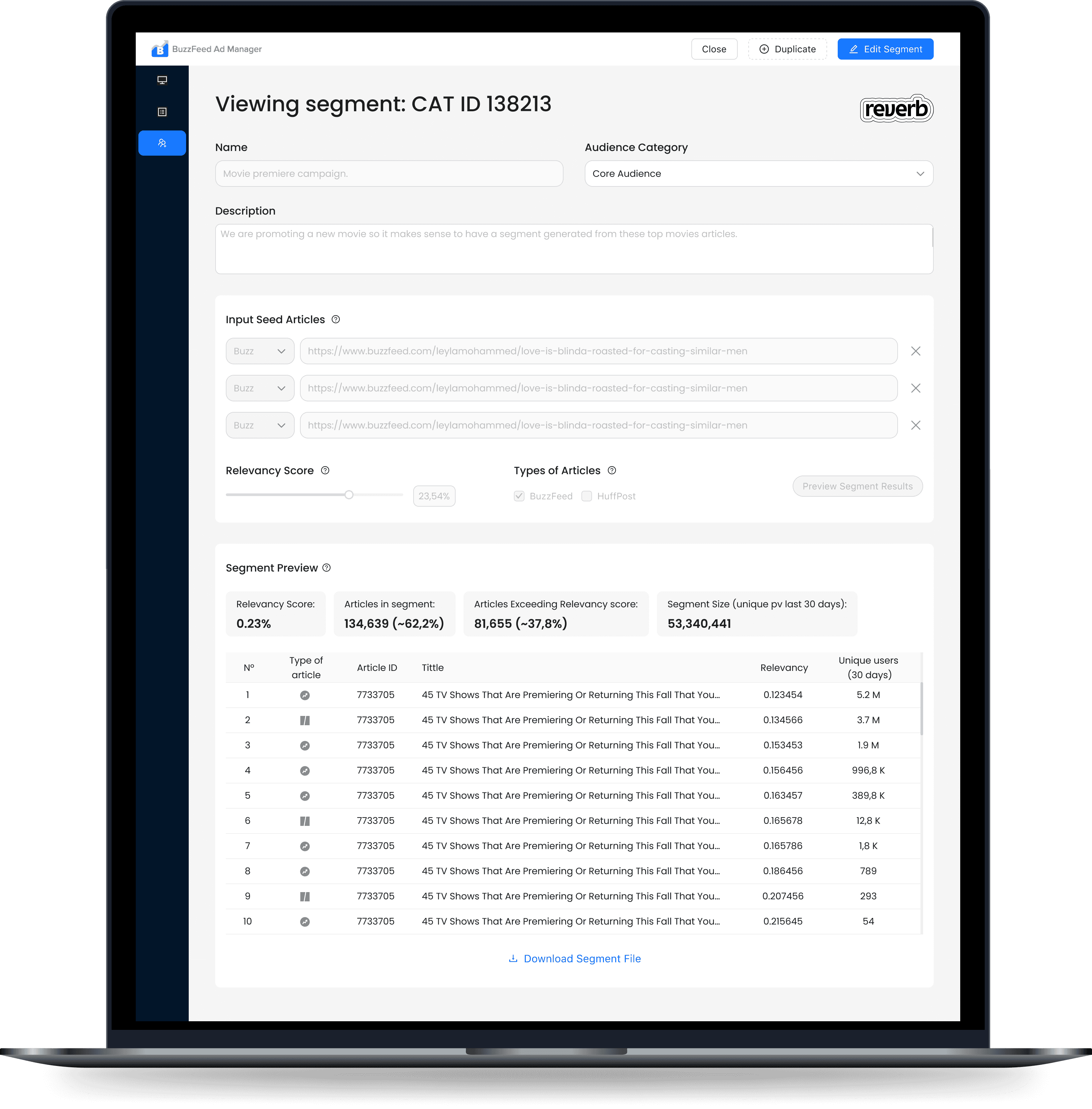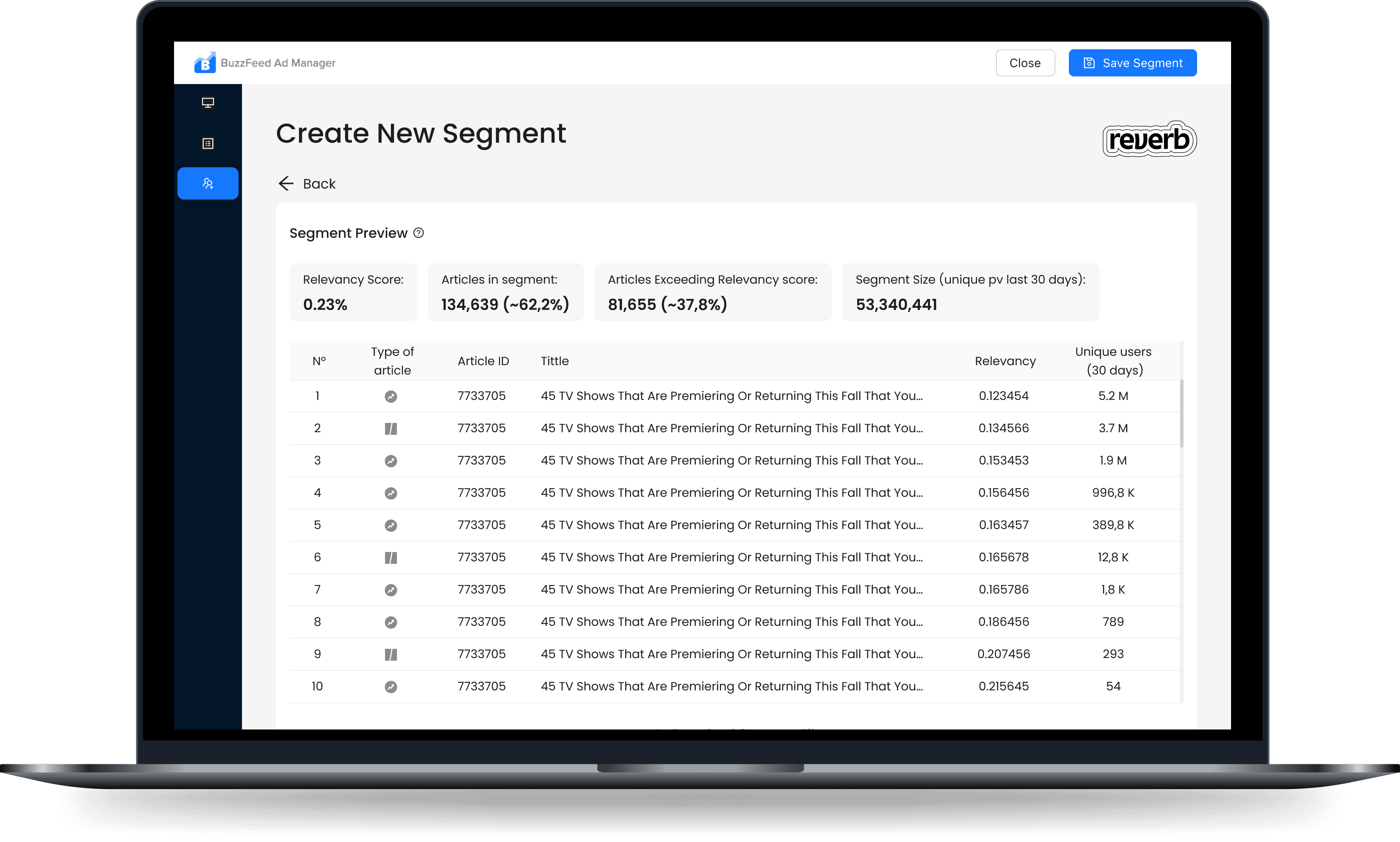 After selecting Seed articles, pick a relevancy score. This will filter how similar the segment must be. Also, this will affect its size; the stricter you are, the smaller the segment pool will be.